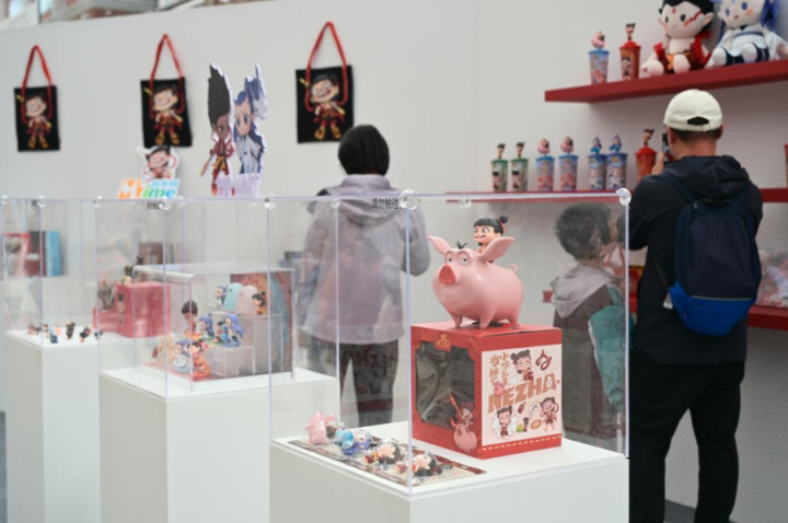 2025年4月19日,电影《哪吒之魔童闹海》破亿手绘海报展上展示的电影衍生文创产品。新华社记者 李鑫 摄